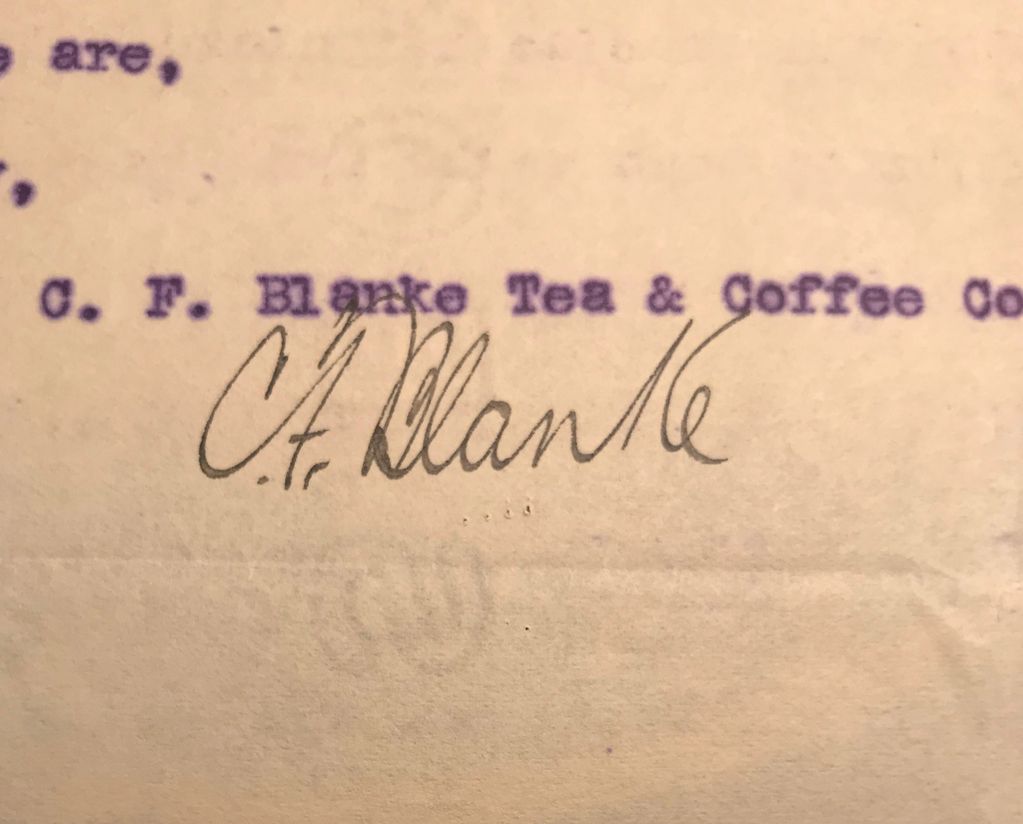 Love coffee, and C. F. Blanke was the coffee king in St. Louis at the turn of the last century. His awesome building still stands at 1310 Papin just south of downtown. His signature is very hard to find.